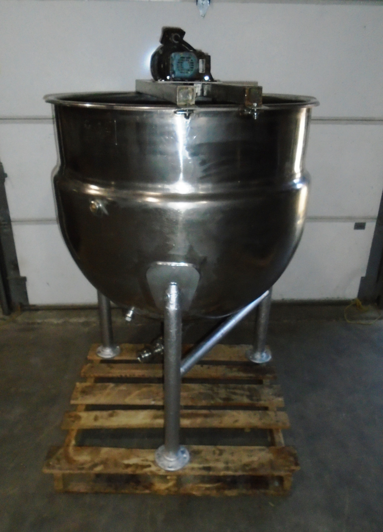 Qty 1. Used approx. 450 Litre (120 Gallon) Stainless Steel Steam Jacketed Kettle with Top Mounted Agitation, on Tri-legs (ALLFAB Rated Manufacture Tag)