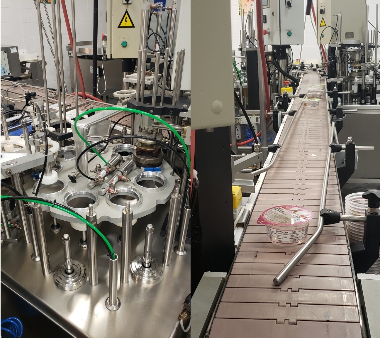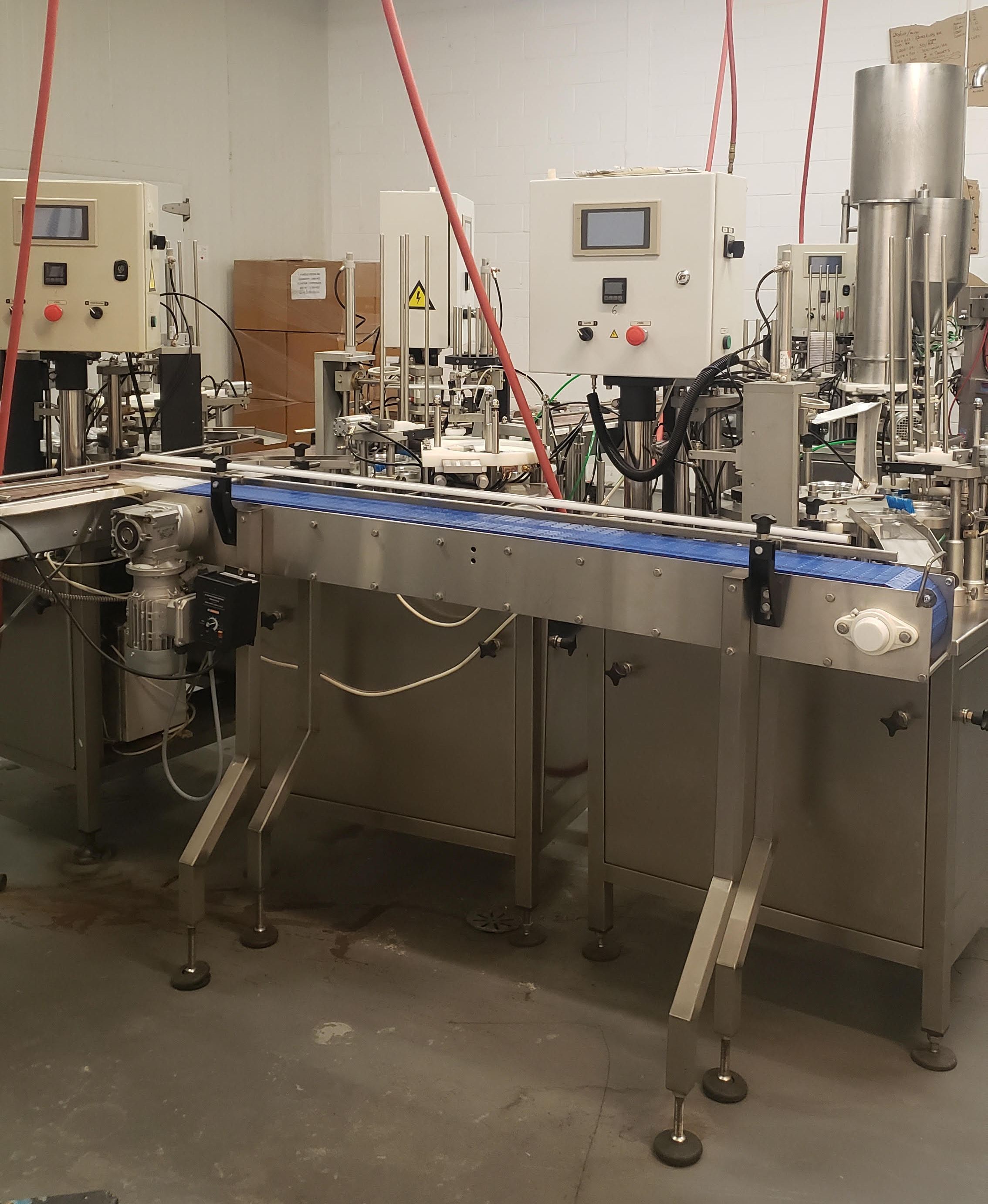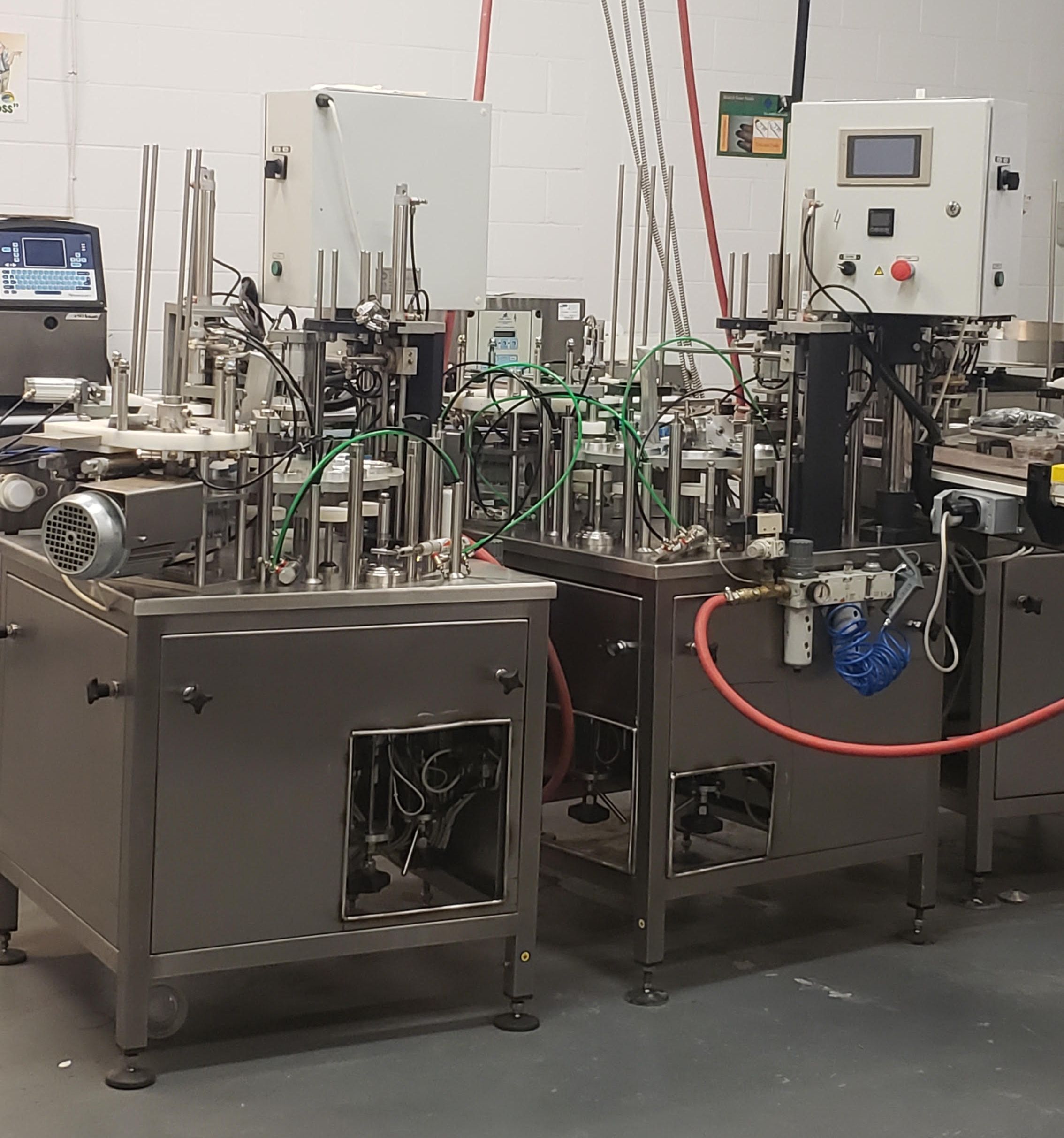 Includes: Qty 3. Used 9 Cup Rotary Filling Sealing Machines with two Nozzles and Stainless Steel Hoppers with Conveyor and more